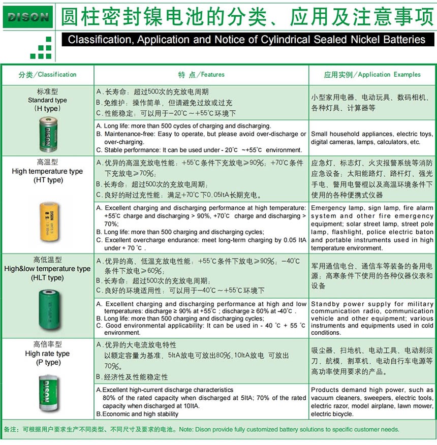 鎳電池容量從100mAh 至 15000mAh不等。通常使用的有標(biāo)準(zhǔn)型、消費(fèi)型、高溫型和大電流放電型等四大類(lèi),可應(yīng)用于任何無(wú)線設(shè)備。
